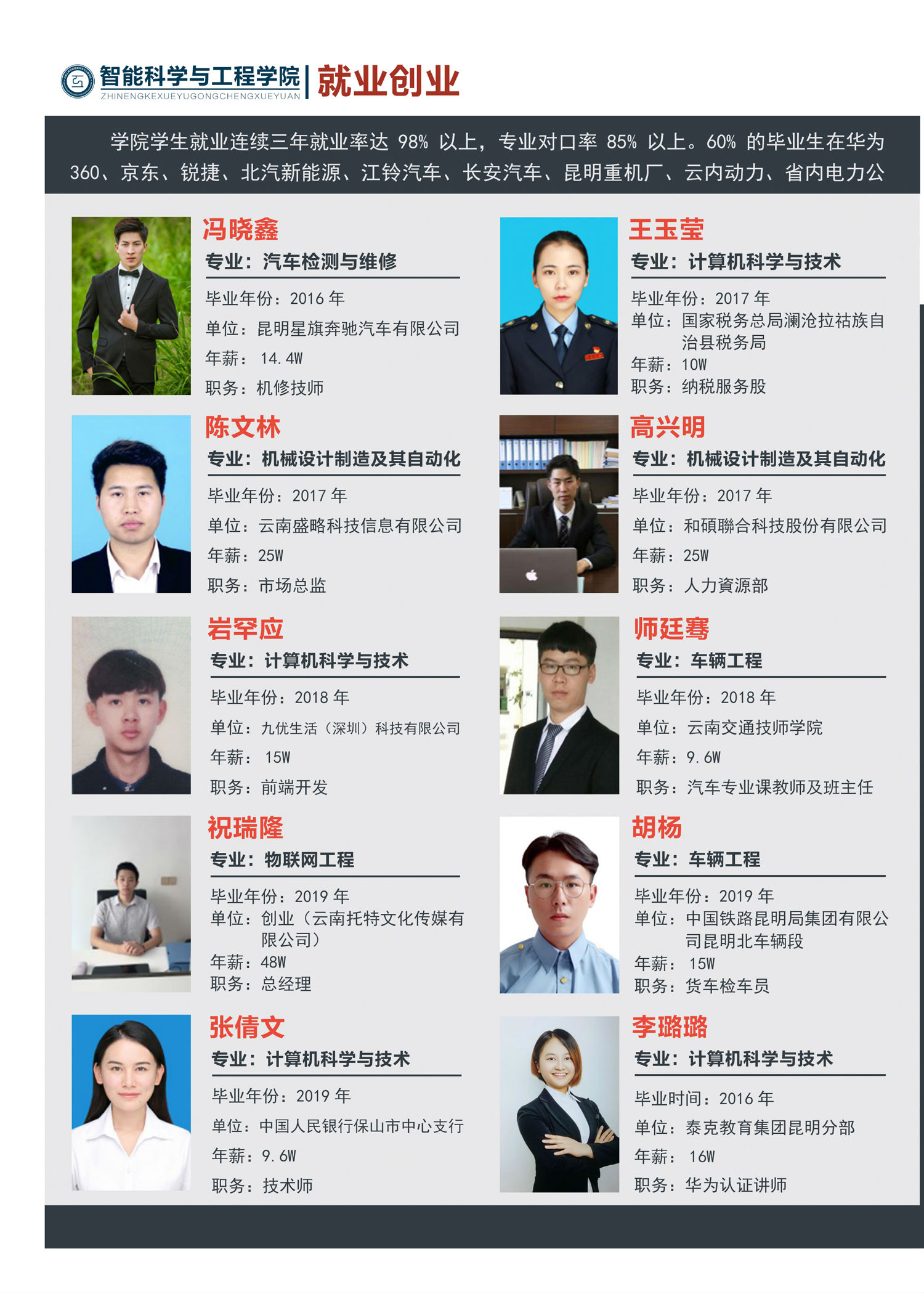 学院学生连续三年就业率高达98%,名企就业23%,专业对口率85%,60%毕业生毕业后与华为、360、京东、锐捷、北汽新能源、南方电网等企业签订合同。