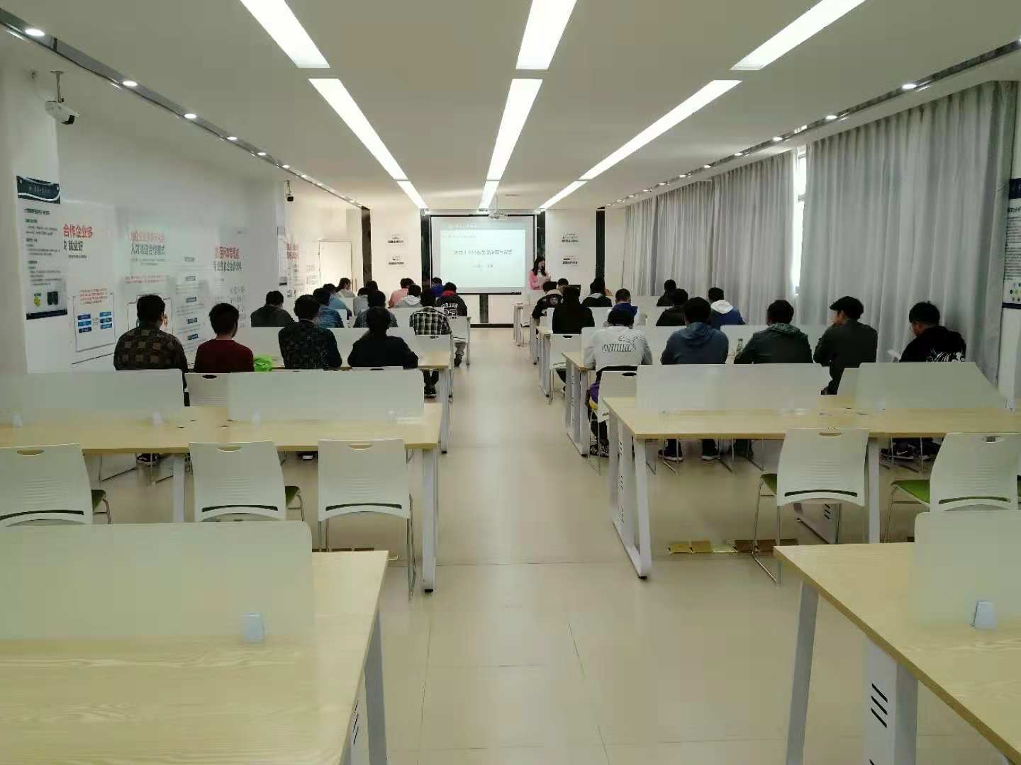 学生研发区间为12套4人办公位,一个会议区,既方便学生以个人为单位在教师现场边教学边演示的条件下进行同步实践学习的模式,又满足学生以小组为单位在教师的带领下对接企业横向课题,展开对项目的讨论、设计和研发。