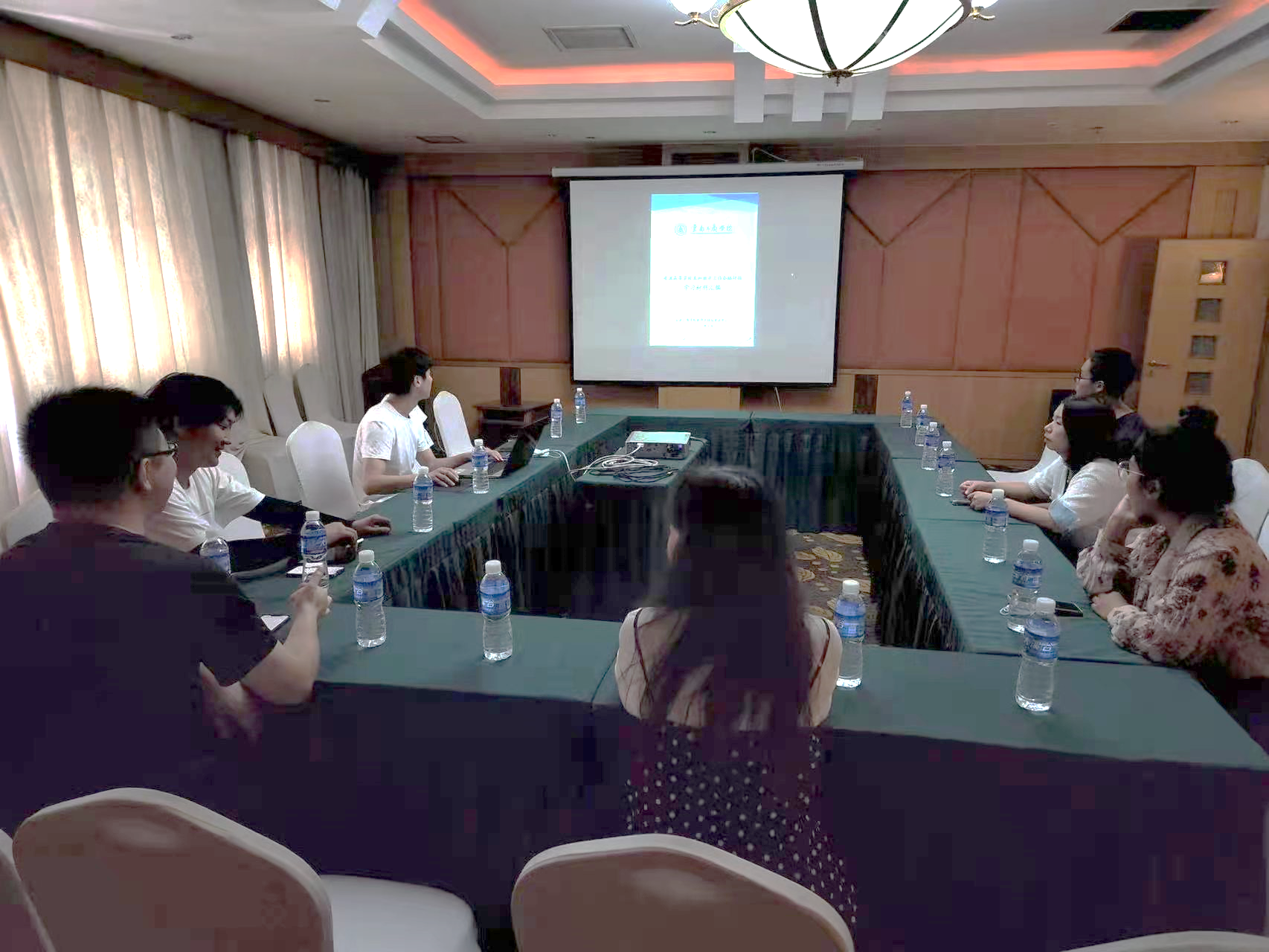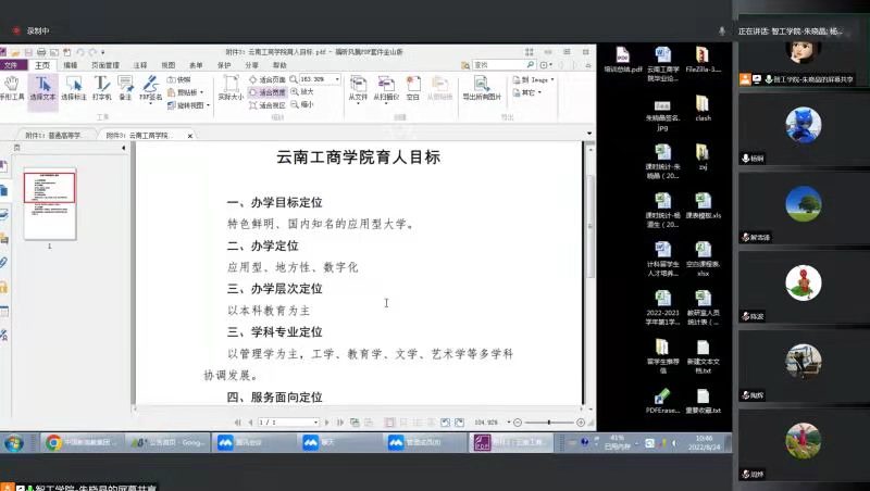 120228231400,于昆明泰隆宏瑞大酒店贵合宫会议室组织了一次线下集中学习,参会人员有:朱晓晶、陈佳骏、陶辉、周烨、张艺竞、刘文静、周咪,因疫情影响无法到达现场的教师同步观看在线直播,保证了全体教师都参与到此次活动中。活动开始由教研室主任朱晓晶老师传达了学校下发的通知精神,强调明确自身责任,加深对相关政策文件的了解,以饱满的精神状态迎接专家组进校评估,并将评估材料的重点做了讲解。最后各位老师交流了学习心得,都认为这样的集中学习很有必要,通过学习对学校、对评估有了更深的理解。