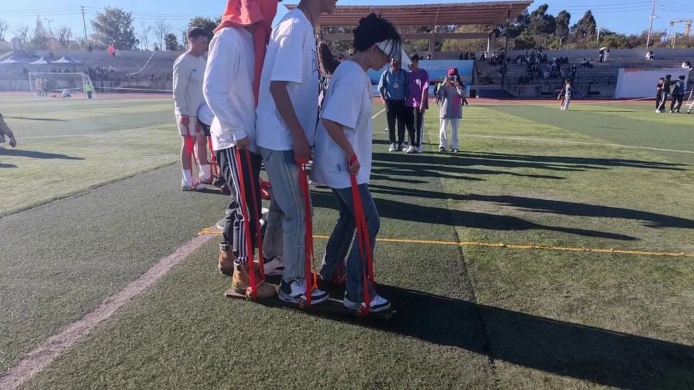 在进行充分的准备后,大家三人一组,不断进行着相互配合,1,2,1,2的口号声下,是每一组的动作协调统一,是每一组团结的体现。