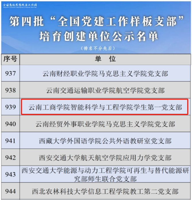 2024年3月18日,教育部公示了第四批新时代高校党建示范创建和质量创优工作遴选结果,云南工商学院智能科学与工程学院学生第一党支部成功入选“全国党建工作样板支部”培育创建单位公示名单。