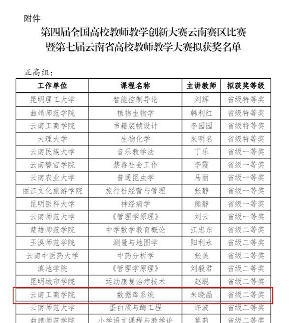 课程目前获得第四届全国高校教师教学创新大赛云南赛区比赛暨云南省第七届高校教师教学创新大赛二等奖。