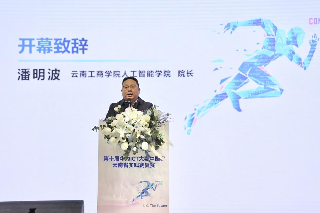 开幕式按议程有序推进,氛围庄重热烈。云南工商学院人工智能学院院长潘明波登台发表开幕致辞,拉开了开幕式的序幕。他明确表示,学院始终以培养高素质、实战型人工智能技术人才为核心使命,此次承接这一省级重要赛事,既是对学院教学质量、实践平台建设水平及综合组织能力的全面检验,更是学院践行产教融合理念、助力区域产业人才战略的具体实践。近年来,学院在课程体系革新、实训基地搭建、校企合作深化等方面成果显著,此次携手华为、泰克教育两大行业标杆共同办赛,正是学院整合优质资源、赋能学子成长、服务行业发展的有力印证,为赛事的高规格、高质量举办提供了坚实保障。