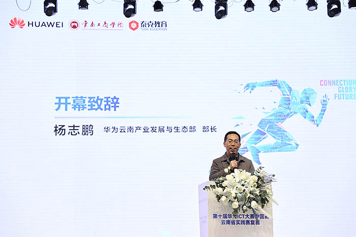随后,华为云南产业发展与生态部部长杨志鹏发表致辞。他表示,华为ICT 大赛作为全球 ICT 领域极具影响力的赛事品牌,是检验高校人才培养质量、衔接产业需求的重要标尺。他高度肯定云南工商学院人工智能学院在区域 ICT 教育创新发展中的引领作用与突出贡献,强调华为将以此次赛事为纽带,深化与学院的战略合作,通过技术赋能、资源共享、人才共育等方式,助力云南培养更多适应数字经济发展的技术精英与行业骨干,为产业转型升级提供人才支撑。最后,泰克教育云南高校市场负责人罗中理则针对比赛规则、评审标准、赛程安排等关键内容进行详细解读,条理清晰的讲解为各参赛队伍提供了明确指引,为赛事公平公正、有序开展筑牢基础,保障了赛事的专业性与权威性。