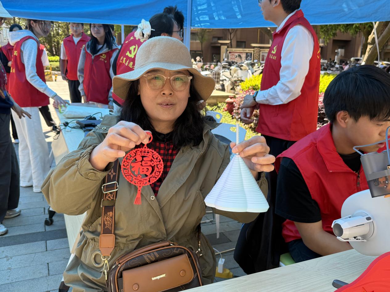 活动现场,“3D打印进社区”体验区成为焦点。红色福字中国结、国风福袋、红旗造型文创、纪念徽章等3D打印成品整齐陈列,吸引众多居民驻足观看。师生党员利用便携式3D打印机,现场演示从数字模型到实体物品的转化过程,并深入浅出地讲解3D打印技术在医疗、航天等领域的应用。在党员志愿者的指导下,小朋友们亲身体验,创作出属于自己的立体作品,在心中播下热爱科学的种子。